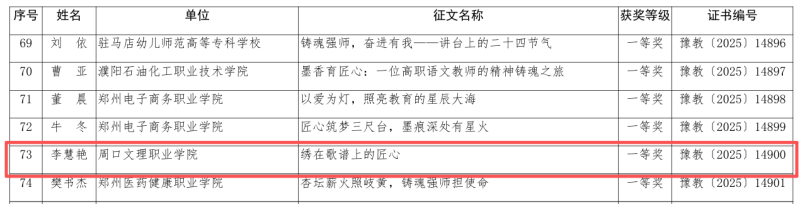 7月22日,河南省教育厅发布了《关于公布“铸魂强师,奋进有我”师德教育主题征文、演讲比赛和师德师风建设优秀案例评选结果的通知》,由我校选拔推荐的教师在此次评选中荣获一等奖。